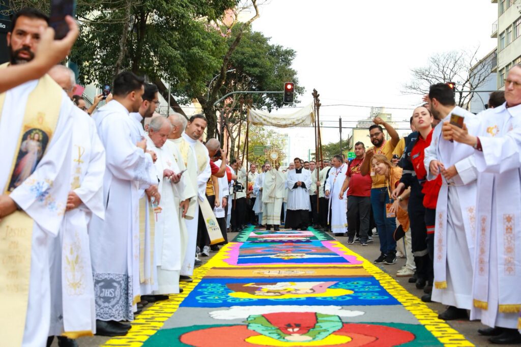 “O sentido primeiro desta festa é Ele que caminha entre nós e nós que O seguimos. Tudo aquilo que é humano, que nos faz irmãos, caminha junto”, destacou o arcebispo metropolitano de Curitiba, dom José Antonio Peruzzo, enquanto percorria o trajeto entre a Catedral Basílica e a Praça Nossa Senhora de Salete. O religioso fez questão de agradecer aos mais de 4 mil voluntários de mais de 120 paróquias, movimentos e grupos ligados à Igreja que desde cedo preparavam os tapetes coloridos para a passagem de Jesus Eucarístico.