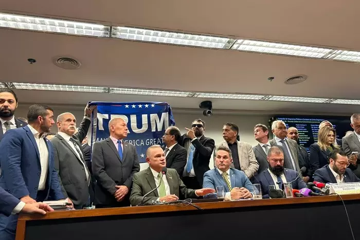 Durante uma entrevista coletiva da oposição na Câmara dos Deputados na manhã desta terça-feira (22), o deputado Delegado Caveira (PL-PA) exibiu uma bandeira do ex-presidente dos Estados Unidos, Donald Trump. A atitude gerou desconforto entre seus colegas de bancada, que pediram para que o item fosse retirado de cena.
